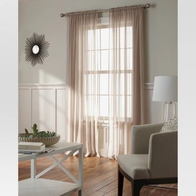 Add interest and get some privacy with the Threshold Chiffon Window Sheer. These window treatments work well alone and even better underneath a heavier curtain for added control of light and privacy. With these curtains drawn you get some natural light but you can block some of the heat and get a little privacy. Open the curtains and you get the full warmth of the sun and your view is highlighted nicely by this soft window sheer.