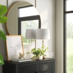 Enhance your wall decor with this Infinity Circle Mirror from Threshold™. This wall mountable mirror features a clean round shape for a modern look. Set in a durable rust-resistant brass frame, it adds a touch of shine to your decor. Use this piece as a functional vanity mirror or as an accent above the sideboard or entryway console to brighten up your space.