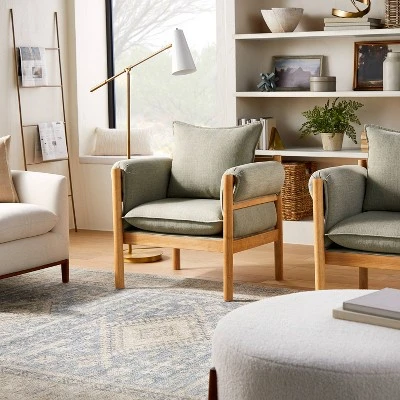 Give your home a refreshed sleek, timeless and modern look with the Arbon Wood Dowel Accent Chair with Cushioned Arms from Threshold™ designed with Studio McGee. This beautiful wood-framed chair has a subtly classic look that complements any design theme in your home. The streamlined design of the sage colored cushions provides comfort and style. Plus, the neutral wood tones add warmth and elegance to any room. This beautiful accent chair is a great piece to add next to a couch or end table for completing a truly polished look. Whether it’s in a bedroom, living room or study, this elegant chair can elevate your home’s style anywhere.